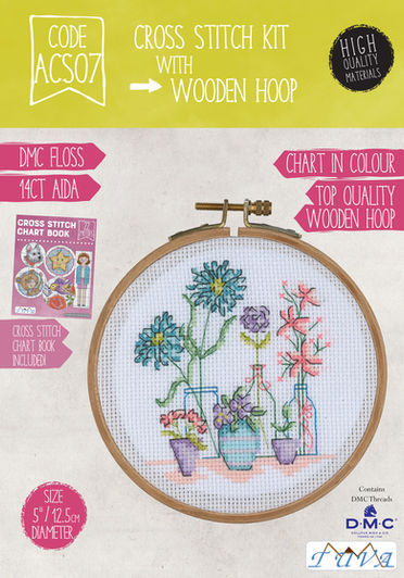 This kit contains pre-sorted DMC Thread, instructions, 14 count aida fabric, full colour chart, needles & wooden hoop.
