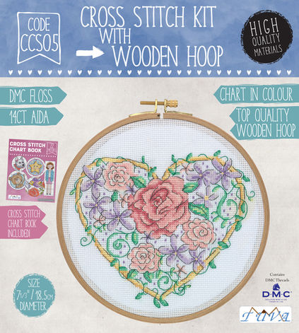 This kit contains pre-sorted DMC Thread, instructions, 14 count aida fabric, full colour chart, needles & wooden hoop.